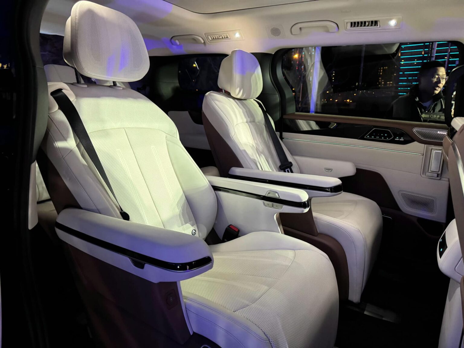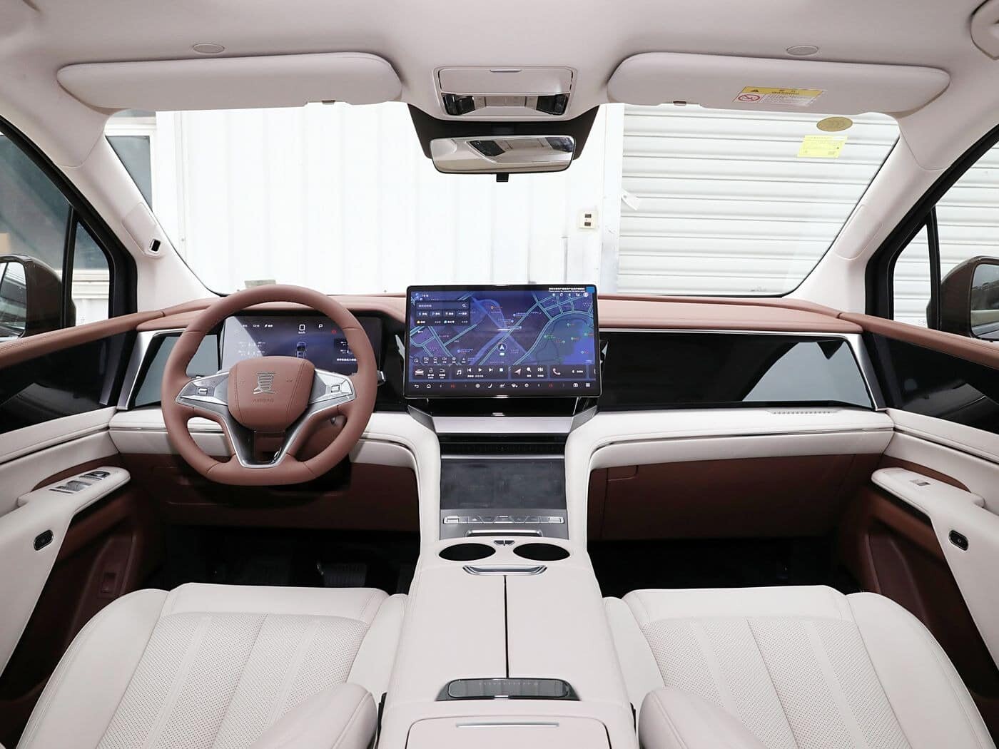Bên trong cabin, M9 được áp dụng ngôn ngữ thiết kế “Dynasty” mới nhất của BYD. Tại các thị trường khác nhau, chiếc xe sở hữu nội thất hai tông màu như nâu-be hoặc xanh-be. Các trang bị tiện nghi nổi bật gồm màn hình trung tâm nổi 15.6 inch, bảng đồng hồ và màn hình hành khách đều có kích thước 12.3 inch. Ngoài ra, xe còn được trang bị bàn làm việc gập, tủ lạnh và màn hình trần xe.